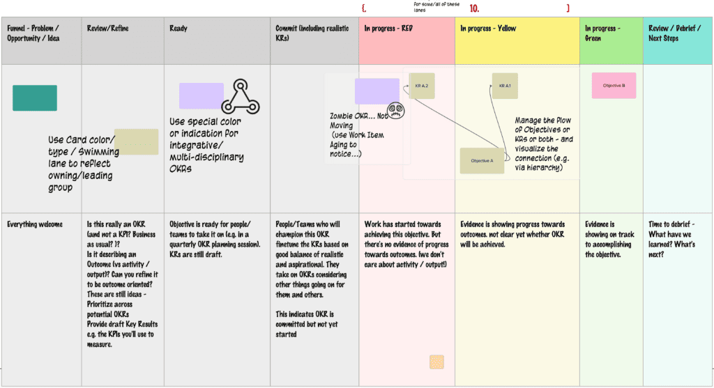 Be honest about whether goals are really moving forward. For example, mark each goal as Red, Yellow, or Green. Start everything in Red, and only shift it forward when there’s real evidence of progress. This helps you focus on what’s stalled, rather than what’s flowing well.