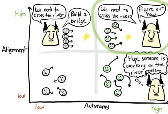 There’s a false dichotomy that many leaders fall for, which is the belief that alignment requires control. Actually, alignment and control are two separate aspects that can work in concert to create effective management. Donald Reinertsen calls this Aligned Initiative. David L Marquet talks about Intent-based Leadership. Henrik Kniberg, in his usual brilliance, maybe nailed it best in this diagram describing Spotify’s “Aligned Autonomy” engineering culture principle (Jason Yip elaborates on this principle here).