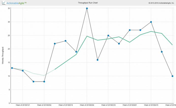 Beyond looking at throughput at the team level, it is interesting to track throughput at the Program-level. One could argue that at this level it makes more sense to take into account Feature size because Features are so varied in size. I’d argue you want to also look at throughput because as we know from WSJF we want to reduce batch size and deliver more frequently and analyzing throughput helps us see how far we are from that vision.