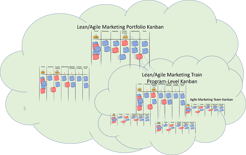 These different kanbans create an hierarchical network of kanban systems where when initiatives from the portfolio kanban get to the implementation stage they get expanded into more tactical marketing plays that then start to flow in the program-level kanban system. When they get to their implementation stage they get expanded into marketing stories that are then managed in a team-level kanban system of one or more teams. As marketing work progresses the flow status can be visualized up the tree and as we decide we finished all marketing stories related to a play/campaign we can collapse back into the marketing play/campaign and continue to finalize its flow at the program-level kanban system. (and similarly all the way up to the initiative.