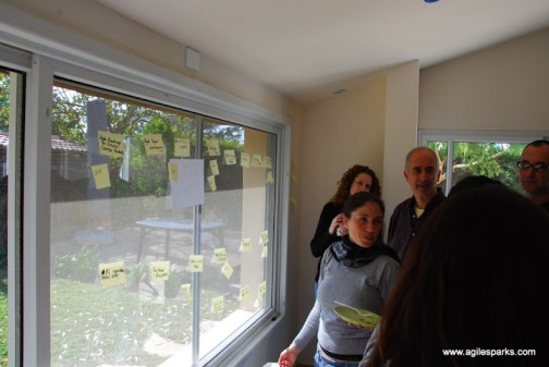 Then we looked at the ideas, collected on a sunny window, both ideas from the spreadsheet as well as other ideas that came up during the warm-up and gathering time. Each of us had to choose an idea he is excited about, and that is how we did team formation. We came up with 3 teams each working on a different idea.